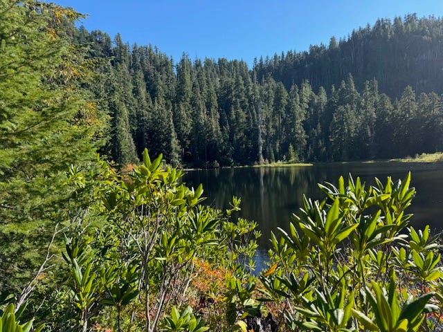 Wavering reflections of conifer spires in Crabtree Lake draw me closer. The lake is the oval eye with lashes of vine maples flashing leaves turned to flame and ember. Closing my eyes and listening to the jingle of Golden-crowned Kinglets, I’m once again lifted out of my human self. If I’ve ever wondered what climate refugia looked like, this is it. A circling Red-tailed Hawk halos the breathing trees. Hidden in the tree crowns, surely there are red tree voles lapping droplets from Douglas-fir needles.