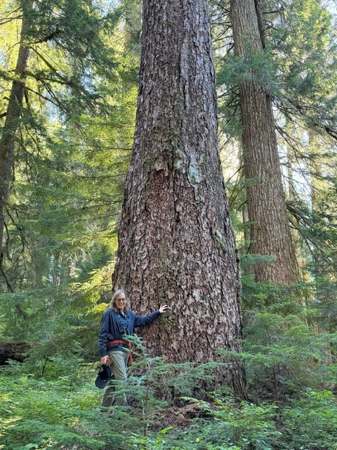 Turning to my companions John Cissel and Chandra LeGue, I feel privileged to be here with them. They are knowledge keepers, old-growth defenders, and educators who share the wisdom of ancient trees. Six feet, five inches tall, with a trim silver beard and wire-rim glasses, John is still dwarfed next to the trees escalating above us. He’s the co-author with his wife Diane of Best Old Growth Forest Hikes: Washington and Oregon Cascades. They’re updating the book by hiking many trails he’d not seen since the 1990s, when he covered 2,000 miles, now adjusting for wildfire and logging incursions. John’s a forest ecologist, past director of the Andrews Forest, and a bit like J. R. R. Tolkien’s character Treebeard, leader of the Ents, who said “Nobody cares for the trees like I do.”