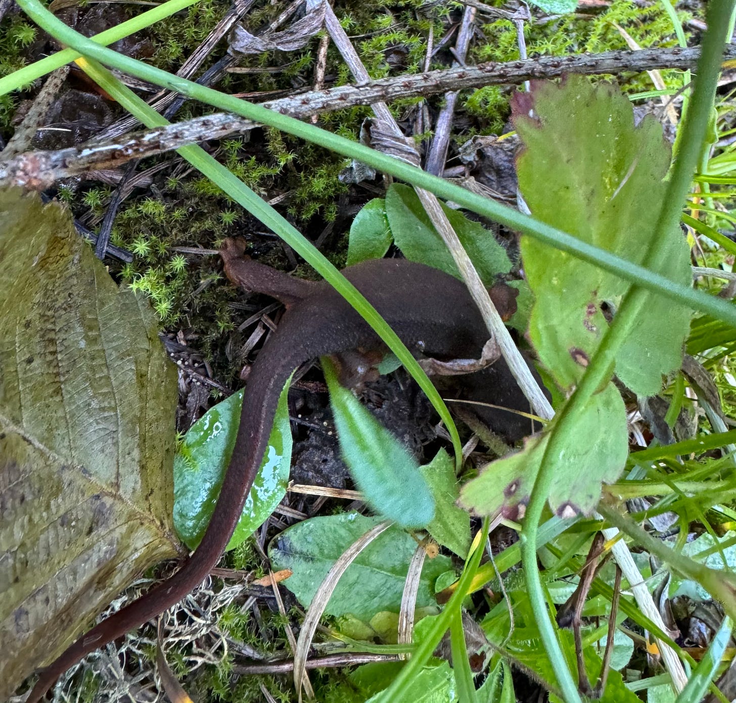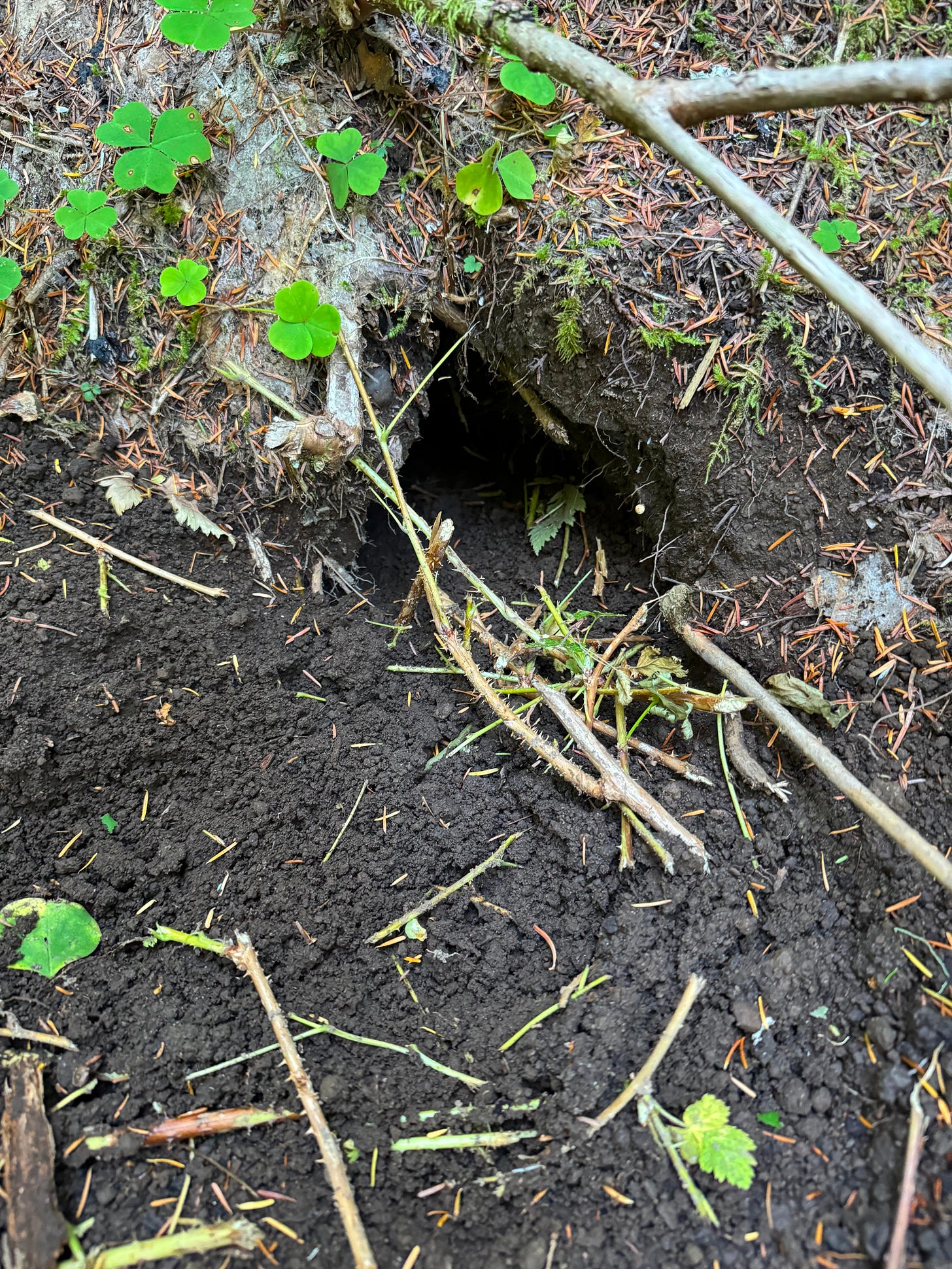 This time, we find bear scat puckered with huckleberries, elk tracks in mud, porcupine-chewed chips below a small tree, and a mountain beaver burrow with a tidy pile of fresh clipped leaves and twigs at the softball-sized entry among ferns. This primitive forest rodent, related to squirrels (not beavers), lives a shy life in underground tunnels and, above ground, never strays for more than a few meters from any of the multiple entries.