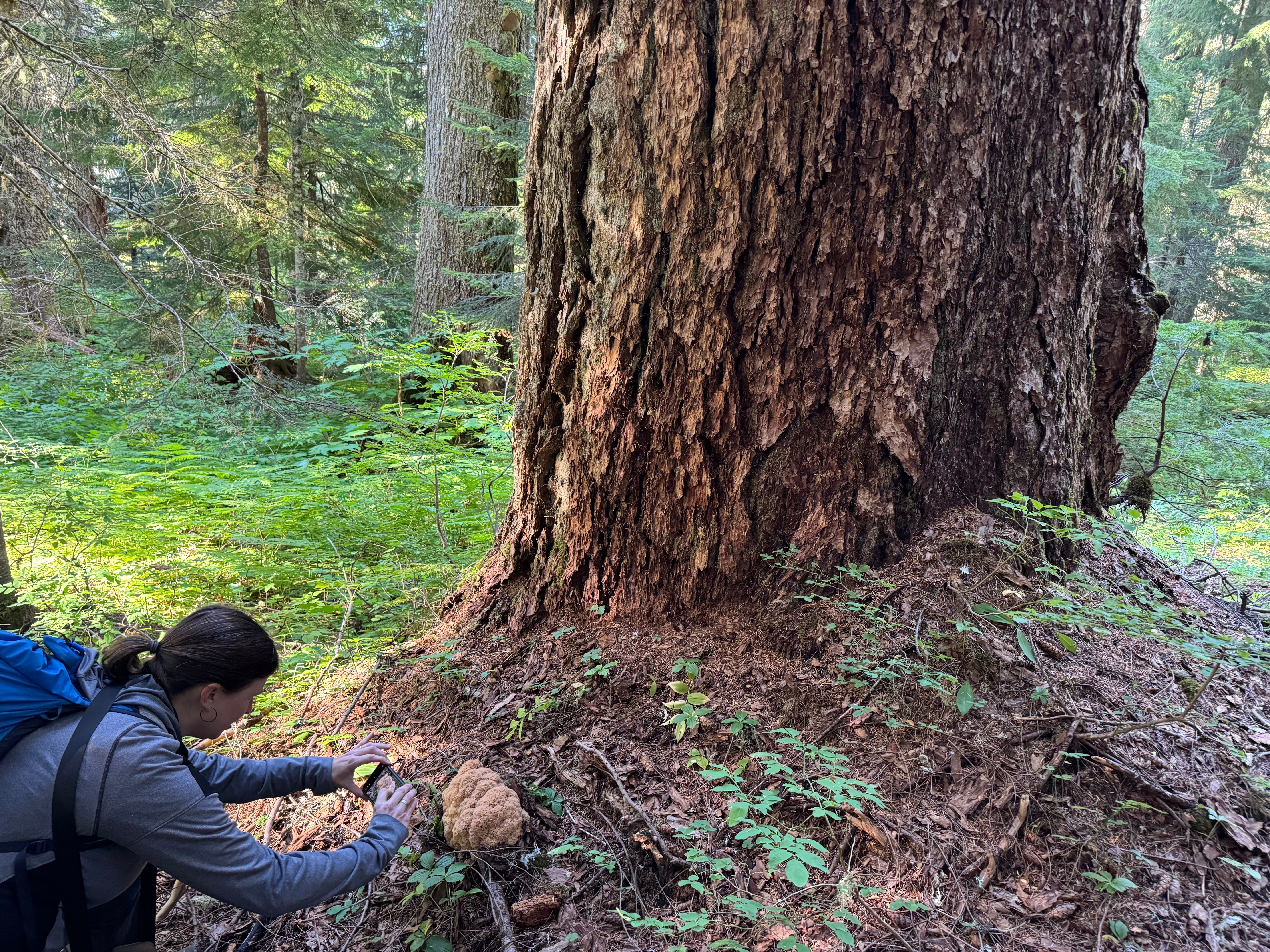 I’m nodding. We’re elfin and childlike in comparison. Scrambling over barrels of mossy nurse logs, Chandra, John, and I come to King Tut. A ridge of bark like fusilli pasta wraps from the base and coils upward as far up as we can see. While spiraling wood grain helps trees withstand stress and distribute nutrients, why would the pattern appear in the craggy bark? John suggests an old fire scar might have been the source. For me, this tree is not King Tut from far away Egypt, but Spiral Tree.