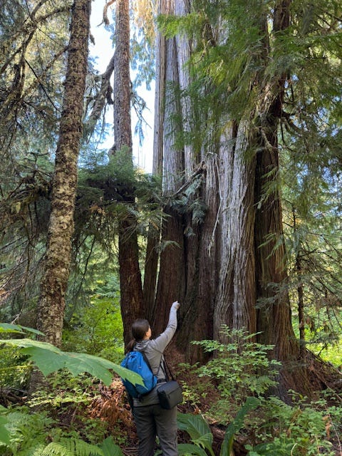 Chandra, of nonprofit Oregon Wild, is one of my favorite tree huggers. She’s leading us to the “King Tut” tree that could well be a thousand years old, measured at 270 feet tall with a diameter close to 8 feet, and 29 feet around. Named by activists to draw attention to Crabtree Valley’s significance, the tree is elusive. To get there, we depend on Chandra’s savvy ability to find her way off trail.