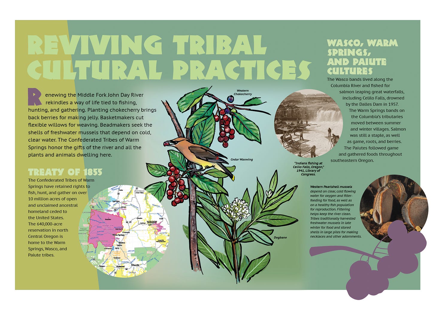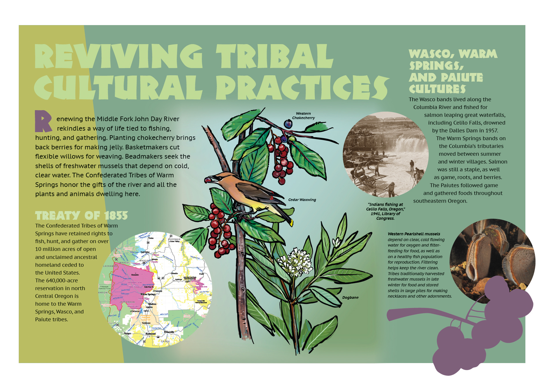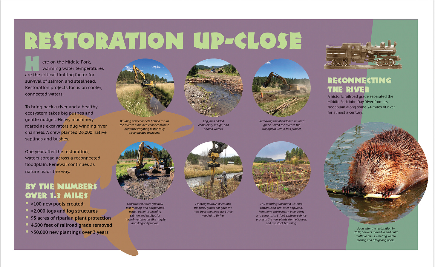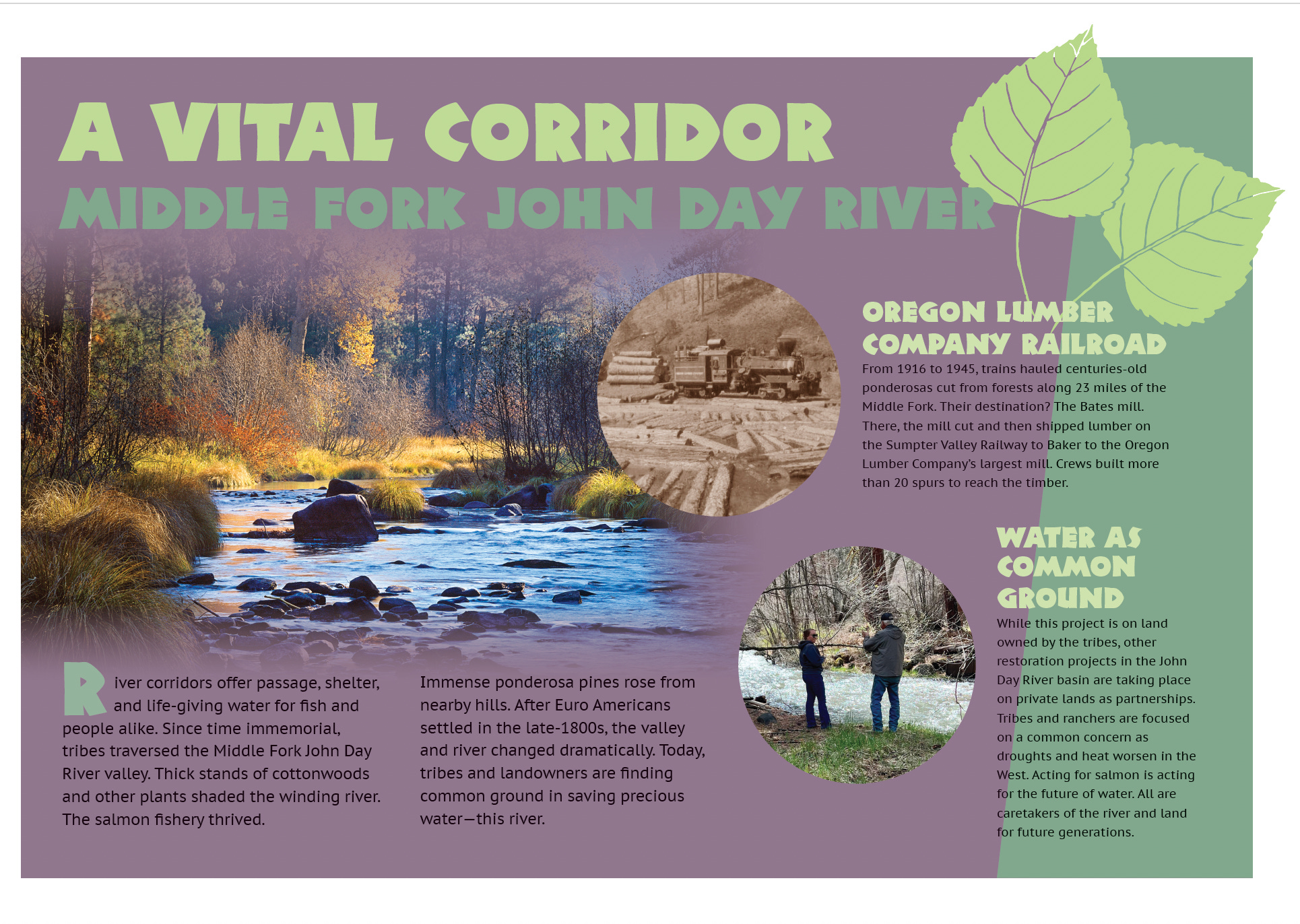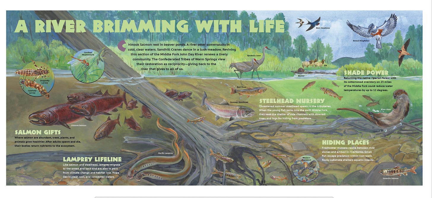But this story is about the Middle Fork of the John Day River in Oregon—where I wrote a series of interpretive displays at a wayside overlooking a major restoration project of the Confederated Tribes of the Warm Springs (see link to the project). The John Day River is the longest free-flowing tributary of the Columbia—from headwaters in northeast Oregon streaming 281 miles to enter just above the John Day dam. Salmon still must navigate three dams, but not the brutal eight dams for fish swimming to the Salmon River.