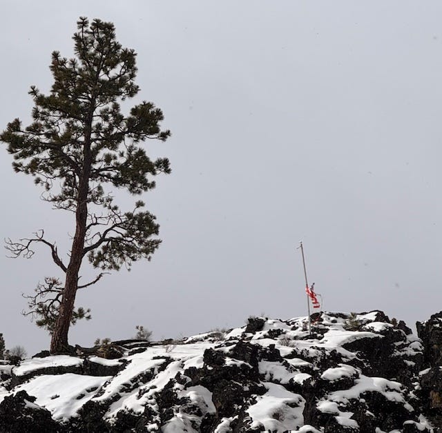 I walked in the wind on the first day of Spring. Behind our house, beyond our patch of pines is a 7000-year-old lava flow. Single trees root into the hope of soils in cracks. All winter, I’ve watched this American flag fray and tatter. I cannot help but think this is a sign. While I find our anthem The Star-Spangled Banner too violent and too hard to sing well, the final lines spoke to me today. “O say, does that Star-Spangled Banner yet wave O’er the land of the free and the home of the brave?”